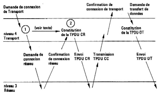 L'activation par le niveau 5 de la primitive du service de transport T-CONNECT-REQUEST a pour effet l'activation par le niveau 4 (après choix de l'adresse réseau du destinataire) d'une primitive du niveau 3 demandant une connexion réseau. Lorsque cette connexion est établie, l'entité de transport peut envoyer la TPDU CR correspondant à rappel en cours. Ce n'est qu’à réception if une TPDU CC que l’activation de la primitive transport T-CONNECT-CONFIRM pourra avoir lieu vers le niveau 5 permettant alors le transfert de données. Il faut remarquer qu'il est parfois possible de passer directement de l'étape 1 à l’étape 2 de la figure 10.15 lorsque le multiplexage est possible et qu’il existe déjà une connexion de réseau satisfaisante.