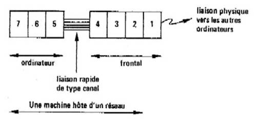 Il est intéressant de situer dès maintenant la localisation des différentes couches de protocole de communication dans un système informatique en contexte réseau. La figure 10.3 montre comment se répartissent souvent les couches de protocole entre un ordinateur et son frontal chargé des communications. Cette découpe des fonctions entre ces deux machines montre bien la séparation entre les couches hautes (5, 6, 7) et les couches basses (1, 2, 3) de l'ISO (les premières sont orientées traitement les secondes orientées communication), ainsi que le rôle charnière joué par la couche transport