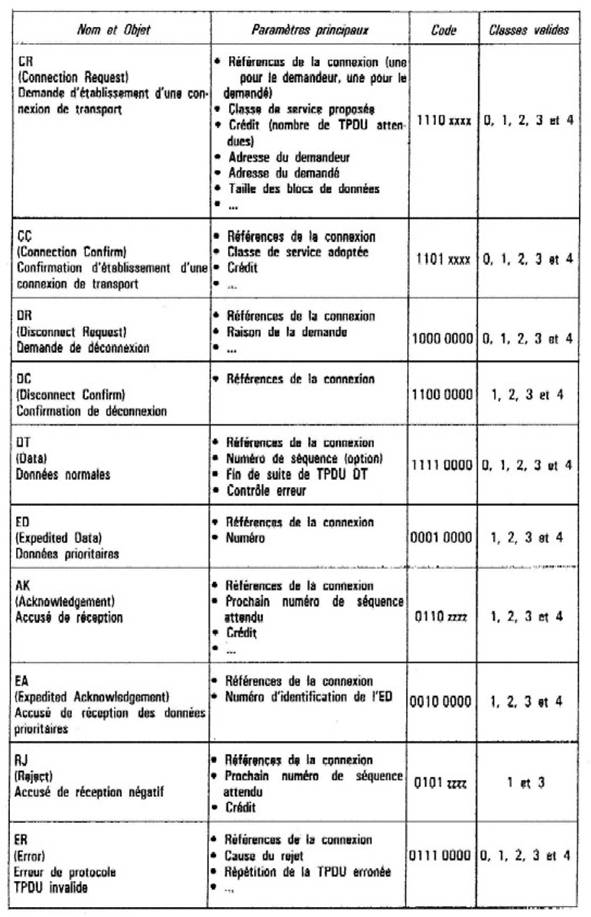 Figure 10.11 : Les TPDU et leurs codes.