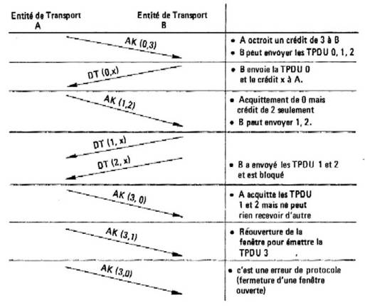 Le mécanisme de contrôle de flux est un système à fenêtre de largeur variable dit système à crédit. Pour expliquer le fonctionnement de ce système, la figure 10.12. schématise une suite de transmissions de TPDU DT et AK où ne sont représentés que les champs numéro de séquence et crédit (i.e. DT (3, 5) indique la TPDU n° 3 avec un crédit de 5). Ce mécanisme est valable dans chaque sens de la transmission. D'autre part, la réduction d'une fenêtre précédemment accordée est illicite et doit donc être considérée comme une erreur de protocole.