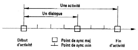 Les points de synchronisation mineure permettent de structurer un échange de données en unités appelées dialogues (intervalle entre deux points de synchronisation majeure). Ces points de synchronisation majeure sont toujours confirmés explicitement et émettent ainsi de rendre des dialogues successifs. Les points de synchronisation mineure peuvent être posés à l'intérieur d'un dialogue et ne sont pas obligatoirement confirmés un à un. La confirmation d'un tel point de synchronisation confirme alors tous ceux qui lui sont antérieurs. L'élément de structuration du dialogue offert par le service de session est l'activité qui est un ensemble d'un, ou plusieurs dialogues. Une activité est un découpage logique des informations qui peut utiliser, pour se dérouler, une ou plusieurs connexions de session (de façon étalée dans le temps). De plus, une connexion de session peut acheminer successivement plusieurs activités distinctes. La figure 11.1. montre un exemple d’activité.