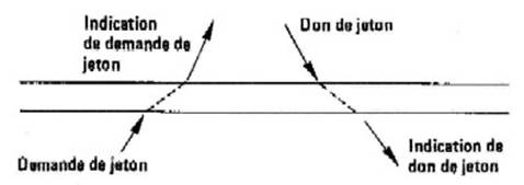 La demande de jeton permet à un utilisateur du service de session de demander un jeton particulier à l'autre participant auquel ce jeton est actuellement assigné. Le don de jeton permet de céder spontanément ou sur demande un jeton dont on souhaite faire partager l'usage. La demande de contrôle de jeton demande l'allocation de tous les jetons à un utilisateur. Ce service ne peut être demandé que lorsque la gestion des activités est effective et qu’aucune activité n'est en cours. La figure 11.3 montre un enchaînement possible de demandes de service dans cette gestion des jetons.
