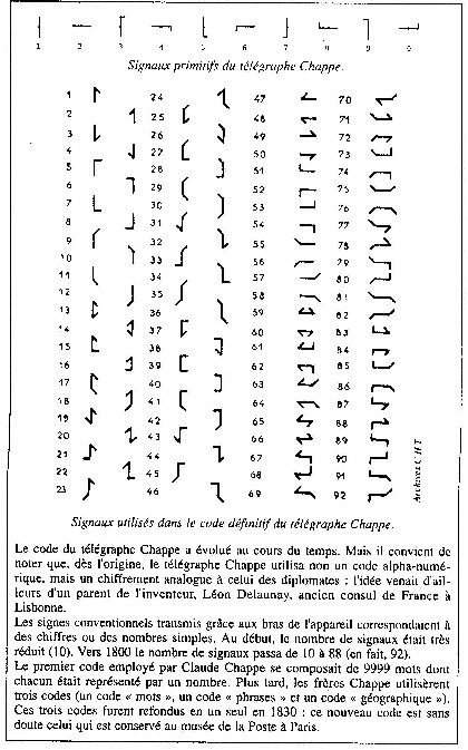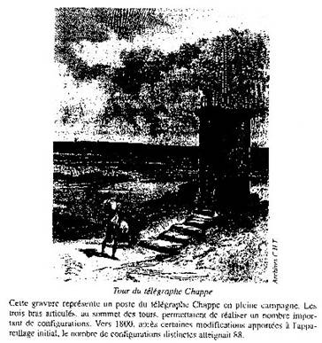 La machine télégraphique de Chappe s'apparentait, par son principe, aux sémaphores. Aux sommets de tours, en visibilité optique les unes des autres, était placé un système formé de trois bras articulés, commandés par un dispositif mécanique : chacun de ces bras pouvait prendre diverses positions. L'ensemble des combinaisons possibles constituait un code que l'on pouvait déchiffrer à distance grâce à des lunettes astronomiques : la distance entre les relais était, au plus, de quelques dizaines de kilomètres.
