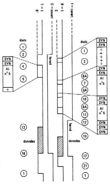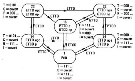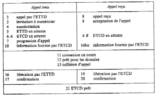 Les deux ETCD (appelant et appelé) passent alors par une succession d'états facultatifs (attente - 6 A, 6 B, information fournie par l'ETCD - 7, 10, 10bis - connexion en cours - 11 -) puis enfin dans l'état 12, prêt pour les données.