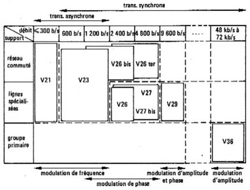 Le CCITT a entrepris la normalisation d'une gamme de modems de manière à faciliter la mise en oeuvre des liaisons de données internationales. Au fur et à mesure que la technologie progresse, de nouvelles possibilités et de nouveaux besoins apparaissent qui nécessitent la définition de nouveaux matériels de transmission, c'est pourquoi la liste des modems normalisés est loin d'être close. On peut considérer qu'un modem se caractérise au moyen de deux paramètres :
