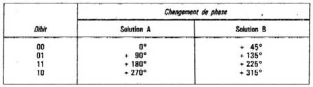 La suite des données à transmettre est divisée en paires de bits consécutives (dibits). Chaque dibit est codé sous la forme d'un changement de phase par rapport à la phase de rélément de signal précédent. Deux possibilités de codage sont normalisées. Elles sont données dans la figure 7.4.