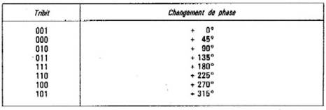 La suite des données à transmettre est divisée en groupe de trois bits (tribits). Chaque tribit est codé sous la forme d'un changement de phase par rapport à la phase de l'élément de signal précédent comme le montre la figure 7.5.