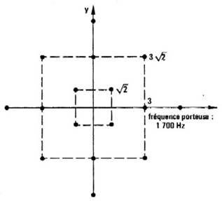 Le signal transmis est un signal à huit valeurs de phase modulé en amplitude (deux niveaux par phase). Le diagramme de Fresnel du signal est illustré par la figure 7.6. Chaque élément de signal correspond à un groupe de 4 bits consécutifs (16 combinaisons possibles) le diagramme a 16 points.
