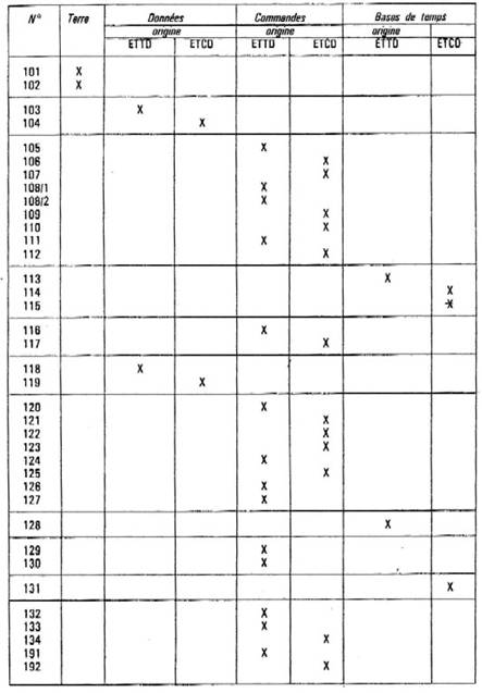 Les circuits suivants seront utilisés : 102 (terre de signalisation) 103 (émission) 104 (réception) 105 (demande pour émettre) 106 (prêt à émettre) 109 (détection de signal en ligne reçu) 114 (base de temps pour l'émission) 115 (base de temps pour la réception).