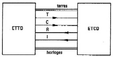 Comme le montre la figure 7. 13, l'interface contient 4 principaux circuits : T (transmission) et C (contrôle) qui sont commandés par l'ETTD et R (réception) et I (indication) qui sont contrôlés par l'ETCD. Il y a en plus un signal d'horloge bit (H) - et en option un signal d'horloge octet (B) - et deux fils de masse. Les circuits C et I ont deux états OUVERT et FERMÉ. Les circuits T et R acherninent en série des caractères de contrôle de données ou des séquences spécifiques de « 0 » et de « 1 ».