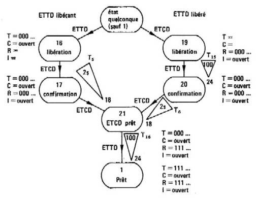 L'indication de libération par l'ETCD est donnée en ouvrant le circuit 107, la confirmation de libération est donnée par l'ETTD en ouvrant le circuit 108 dans un délai maximum de 100 ms.