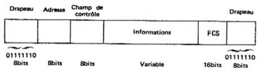 Sur la figure 8. 3 nous avons représenté le format des blocs d'information qui doivent transiter sur la liaison. Le drapeau est constitué par une suite de 8 bits 01111110 qui définit les frontières de la trame. Un seul drapeau peut être utilisé entre deux trames adjacentes, pour fermer et ouvrir à la fois deux trames. Le drapeau sert aussi de caractère de synchronisation. Il peut aussi être envoyé en continu lorsque la liaison n'est pas utilisée, de manière à conserver la liaison ouverte et détecter des cassures de la ligne. Une trame qui n'est pas bornée par deux drapeaux et qui contient moins de 32 bits est considérée comme non valide.