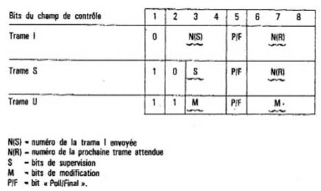 Les deux premiers numéros sont déterminés à l'initialisation. Le champ de contrôle indique le type de trame et le numéro de la trame. Il sera décrit en détail dans les éléments de procédure. Le champ d'information est optionnel. Il transporte les bits qui sont remis au niveau paquet du récepteur. Le FCS est utilisé pour la détection des erreurs de transmission à l'intérieur des trames, il porte sur les champs adresse, contrôle et informations.