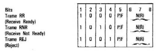 Cette trame de supervision permet d'indiquer que la station émettrice est prête à recevoir de nouvelles trames. Elle-peut être utilisée pour annuler un ordre de non-réception (trame RNR). Elle acquitte toutes les trames précédeminent reçues jusqu'au numéro N(R) - 1. Son utilité réside principalement dans son rôle d'acquitter positivement des trames reçues par un récepteur n'ayant aucune trame I à transmettre. Le bit P/F peut être utilisé; s'il est à 1, la trame RR demande l'état de son correspondant. Donnons un exemple d'utilisation du bit P/F. Soit un noeud A qui n'a à transmettre qu'une trame vers le noeud B et le noeud B qui n'a aucune trame à transmettre vers A. Supposons que la trame envoyée par A soit erronée et de ce fait ignorée par le noeud B. Le noeud B ne peut pas envoyer de trame spéciale, REJ, pour demander une transmission puisque les erreurs sont détectées par des ruptures de séquence et que le noeud B ne reçoit pas de trame dont le numéro N(S) est différent de V(R). La reprise ne devrait pouvoir s'effectuer que sur un temps maximum (time-out) dépassé. Cependant le noeud A peut émettre à la suite de sa trame d'information des trames RR avec le bit P/F à 1 pour réclamer un état du récepteur. Le noeud B émettra une trame RR avec N(R) = V(R) ce qui permettra au noeud A de s'apercevoir que le noeud B n'a pas reçu la trame envoyée auparavant. La retransmission pourra s'effectuer sans attendre la fin d'un temps maximum.