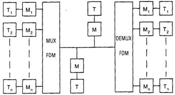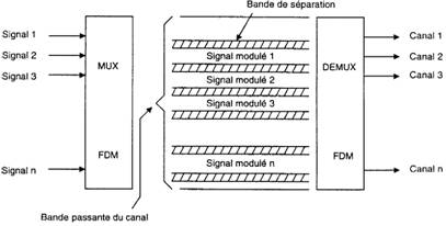 Cette technique rend possible la transmission, en même temps, sur un canal unique, de plusieurs signaux analogiques. C'est la plus ancienne des techniques de multiplexage. Toute personne possédant un appareil de radio ou de télévision est familière avec ce type de multiplexage puisque l'antenne reçoit en même temps plusieurs signaux, chacun modulé avec une porteuse unique. Il s'agit alors de sélectionner le canal désiré en ajustant le récepteur à la porteuse du canal choisi. Le principe général du FDM est illustré à la figure 6.1.
