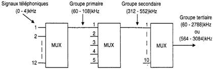 Figure 6.2 : Hiérarchie FDMLe premier niveau de multiplexage regroupe 12 canaux en utilisant 12 porteuses différentes afin de générer 12 signaux BLU qui seront regroupés (multiplexés) pour former le groupe primaire (figure 6.3). Il faut noter que la différence entre deux porteuses adjacentes est de 4 kHz.
