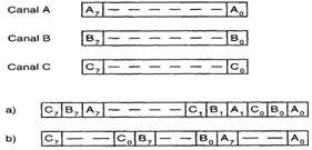 Une trame peut être formée en regroupant les bits individuels venant de chaque canal (figure 6.6a), ou les caractères individuels (figure 6.6b), si la portion de temps allouée à chaque canal est suffisamment large.
