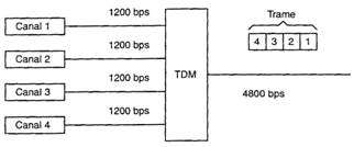 Si chacun des canaux transmet à 1200 bps à la sortie du multiplexeur, la vitesse minimale de transmission doit être égale à 4800 bps.