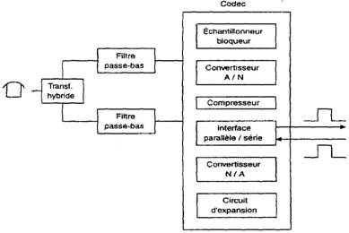 Le codec est un circuit composé d'un codeur MIC ou Delta qui transforme un signal analogique en un signal numérique et d'un décodeur qui effectue la conversion inverse. La figure 6,8 donne le schéma d'une liaison téléphonique numérique utilisant un Codec fonctionnant en duplex intégral. Le transformateur hybride assure la conversion de 2 fils en 4 fils et inversement. Ensuite, un filtre passe-bas limite la bande du signal à 4 kHz tel que prévu par les normes internationales. Le codeur est constitué d'un échantillonneur bloqueur, d'un convertisseur A/N, d'un compresseur selon la loi ou la loi A et d'un convertisseur parallèle-série. Le décodeur est constitué d'un convertisseur série-parallèle, d'un convertisseur N/A et d'un &cuit d'expansion. Le signal analogique est filtré par un filtre passe-bas se trouvant dans le circuit de réception avant d'être envoyé vers le récepteur de l'appareil téléphonique. Selon les normes internationales, la fréquence d'échantillonnage est de 8 kHz et le convertisseur A/N fournit un code de 8 bits par échantillon. Le temps entre deux échantillons successifs est alors de 125 gs et la vitesse de transmission est de 64 kbps.