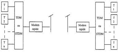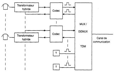 Lorsque le signal téléphonique est converti en signal numérique série. A peut être multiplexé en TDM avec d'autres signaux du même type ou des signaux numériques venant de terminaux, ce qui permet d'intégrer les signaux analogiques et numériques et de les acheminer sur le même support de communication (figure 6.9).