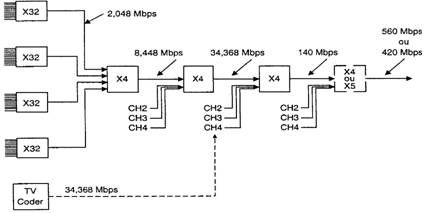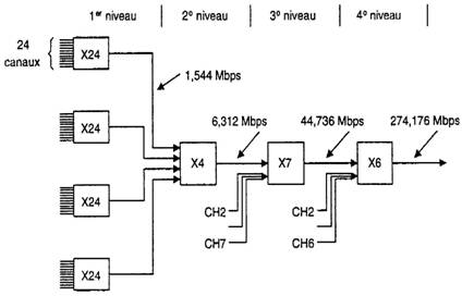 Figure 6.10.a : Hiérarchies TDM (PCM) téléphonique telle qu'utilisée en Amérique du Nord et au Japon